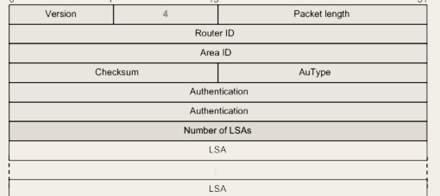 1. The neighbouring router responds to the Link state request (LSR) with a Links State Update (LSU). The LSU Packet contains contains full single or multiple LSA’s. In fact the LSU packets are used to flood LSA’s to neighbouring routers, it’s also used to respond to Link State Request LSR.