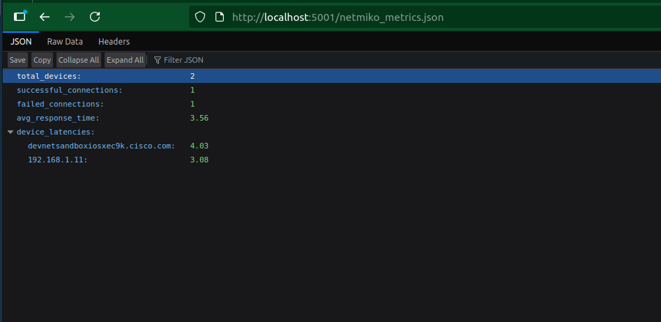 And here’s the output of our serialised JSON format metrics file(netmiko_metrics.json)