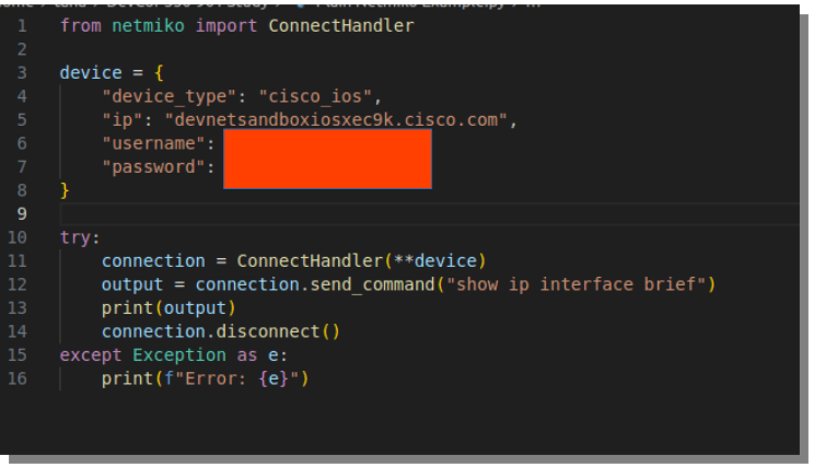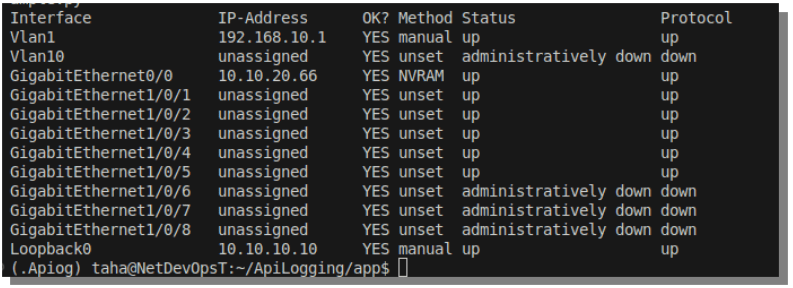 I’ll start with a minimal Python script that connects to a Cisco IOS-XE(Catalyst 9000 Always on sandbox courtesy of Cisco) and runs a simple “show ip interface” command – it is important to comprehend the understanding and differentiation of logging and observability, hence why I used a basic script which most network engineers are familiar with regardless of their network application development skill level.