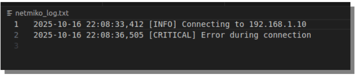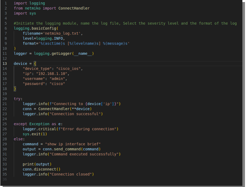 now let’s recreate the script simple netmiko script utilising the logging module. I will intentionally use a the management IP of a IOS device that does not exist :