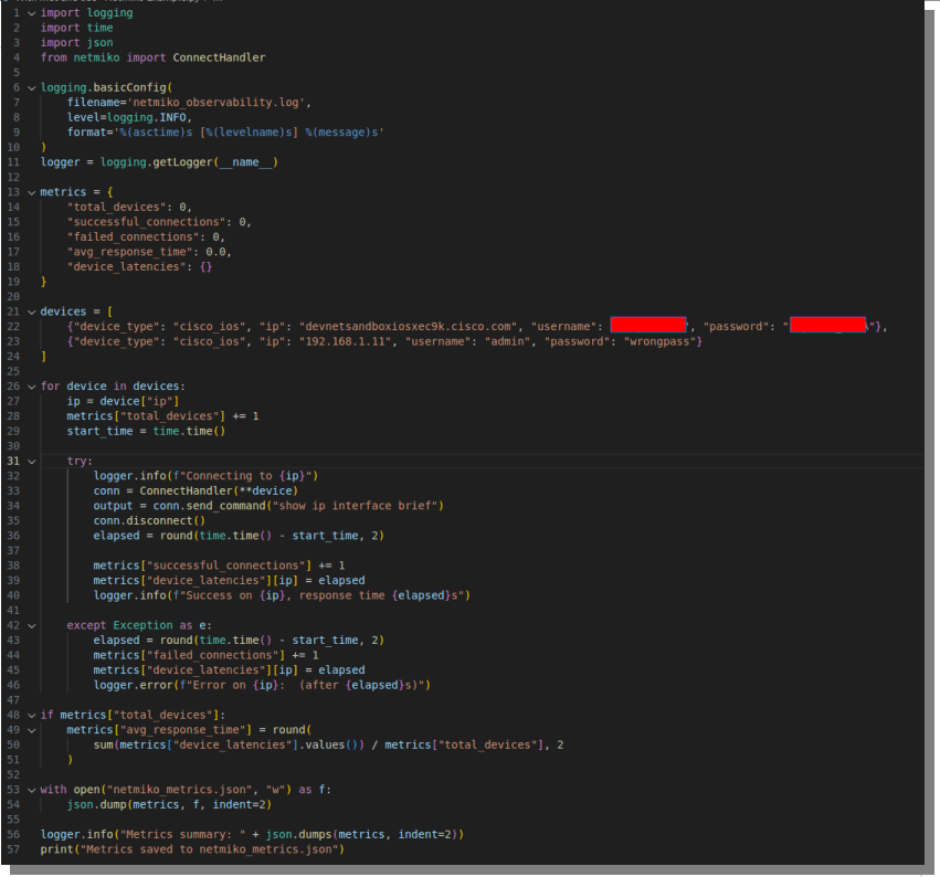 We can build simple observability into the netmiko script by tracking metrics such as: